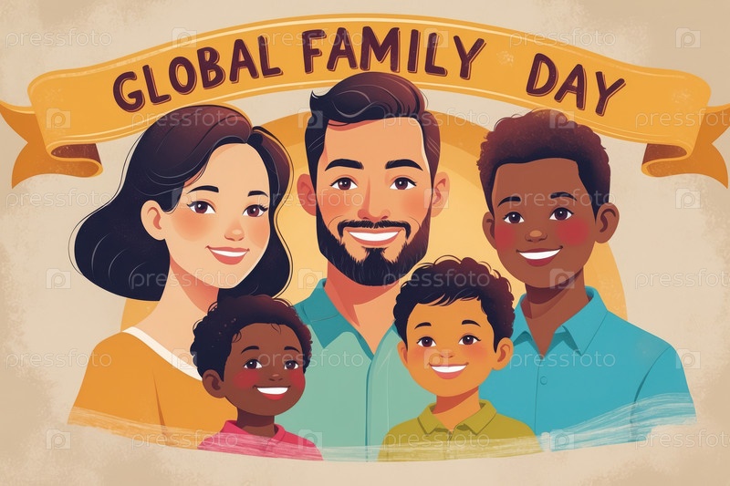 Поздравительная открытка с международным днем семьи, улыбающиеся счастливые люди, родители и дети