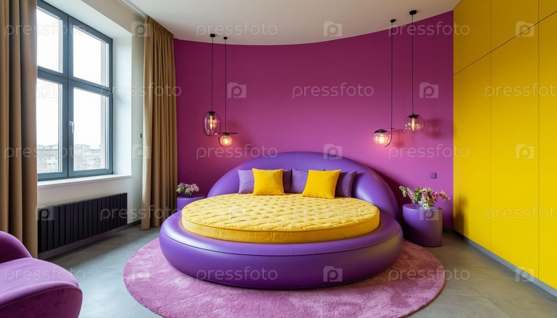 Современная спальня с круглой кроватью сиреневой и желтой. Сгенерированный ИИ