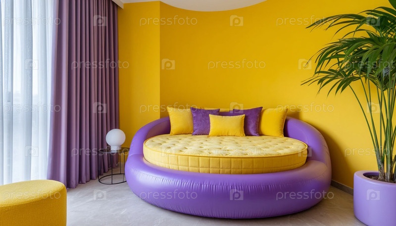 Современная спальня с круглой кроватью сиреневой и желтой. Сгенерированный ИИ