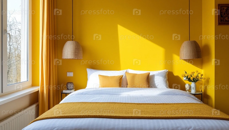 Спальня в солнечных желтых тонах с панорамным окном. Сгенерированный ИИ