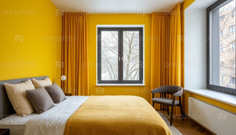 Спальня в солнечных желтых тонах с панорамным окном. Сгенерированный ИИ