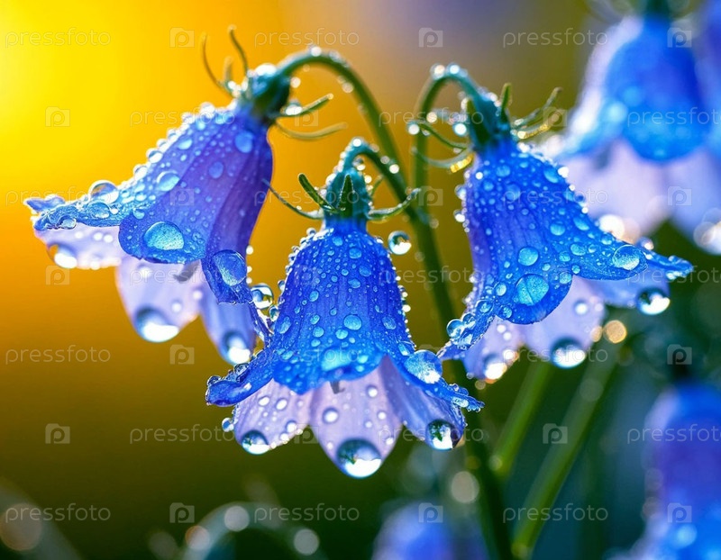 Нежные светящиеся дикие цветы колокольчики после дождя. Сгенерированный ИИ