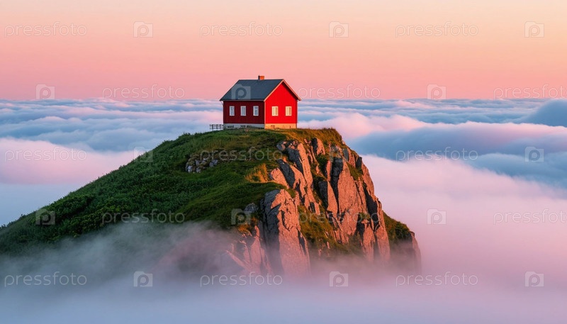 Одинокий дом на вершине горы. Сгенерированный ИИ