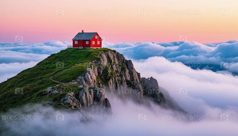 Одинокий дом на вершине горы. Сгенерированный ИИ
