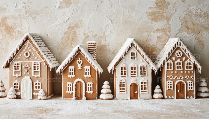 Набор пряничных домов на белом столе. Сгенерированный ИИ