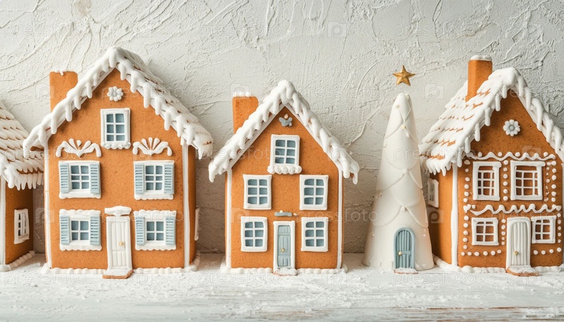 Набор пряничных домов на белом столе. Сгенерированный ИИ