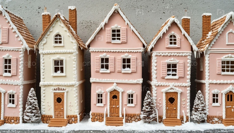 Набор пряничных домов на белом столе. Сгенерированный ИИ