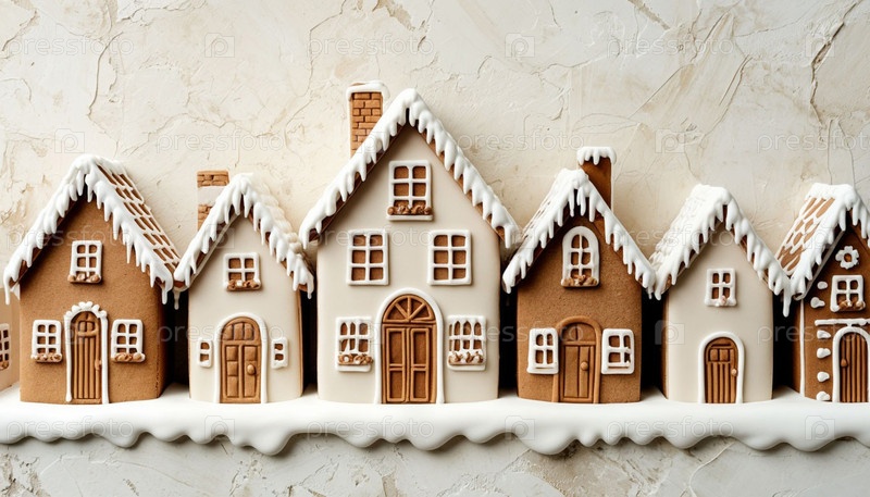 Набор пряничных домов на белом столе. Сгенерированный ИИ