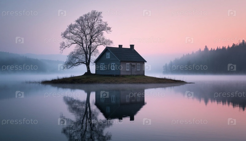 Одинокий дом на воде, тишина и покой. Сгенерированный ИИ