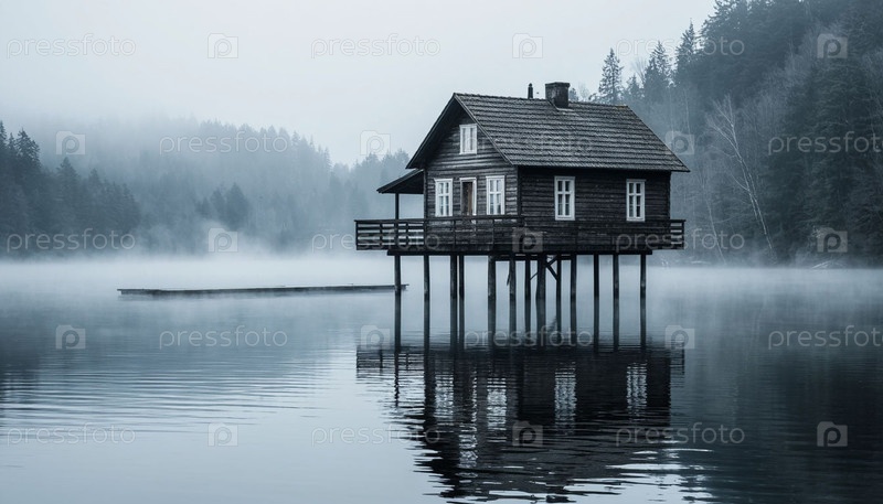 Одинокий дом на сваях посреди озера. Сгенерированный ИИ