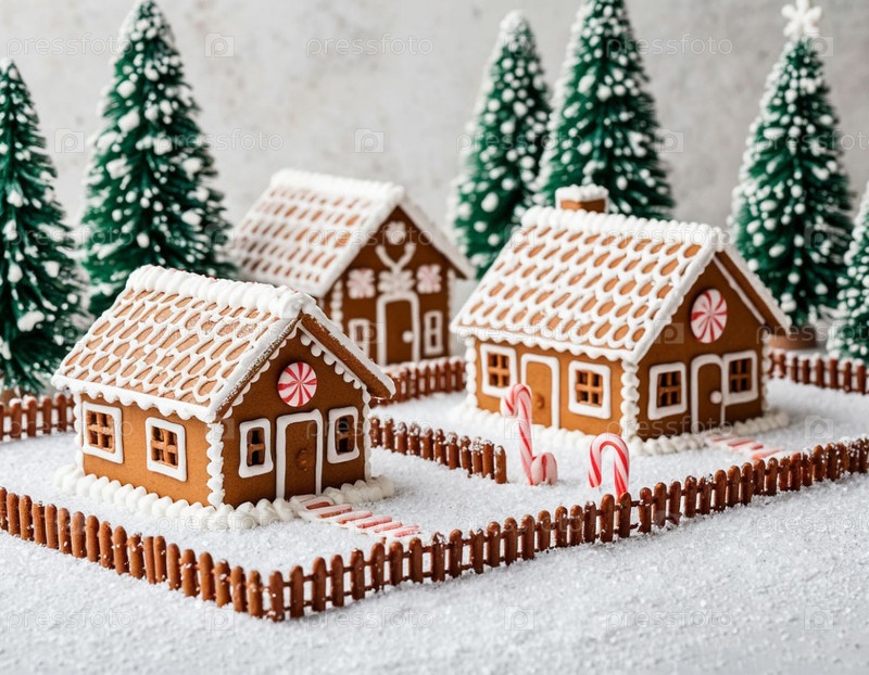 Набор пряничных домов на белом столе. Сгенерированный ИИ