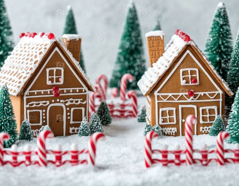 Набор пряничных домов на белом столе. Сгенерированный ИИ
