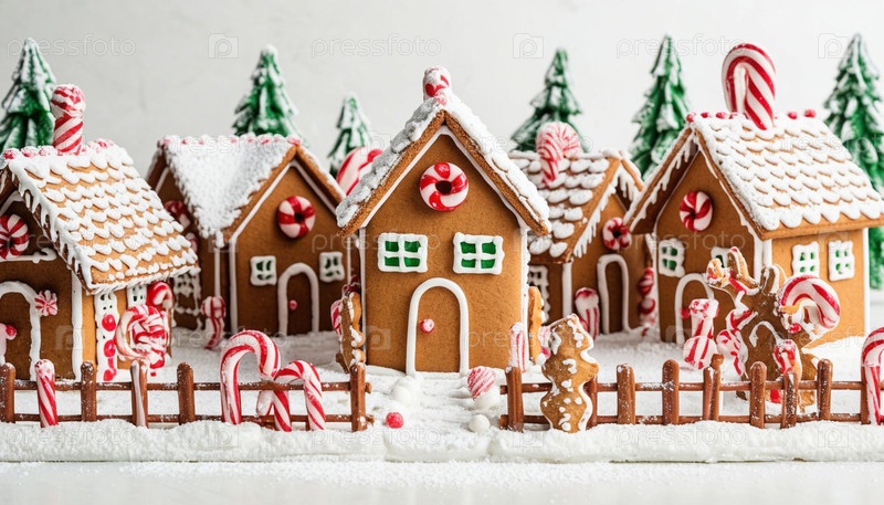 Набор пряничных домов на белом столе. Сгенерированный ИИ