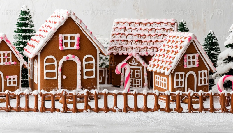 Набор пряничных домов на белом столе. Сгенерированный ИИ