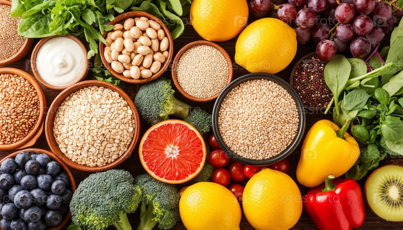 Здоровая пища с повышенным содержанием клетчатки, вид сверху. Сгенерированный ИИ