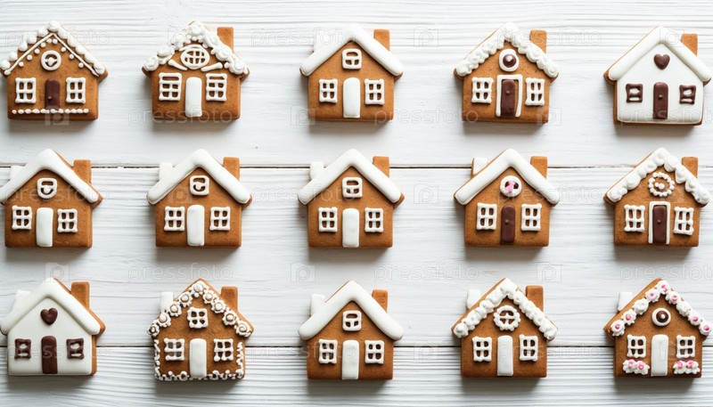 Разнообразные пряники на белом столе. Сгенерированный ИИ
