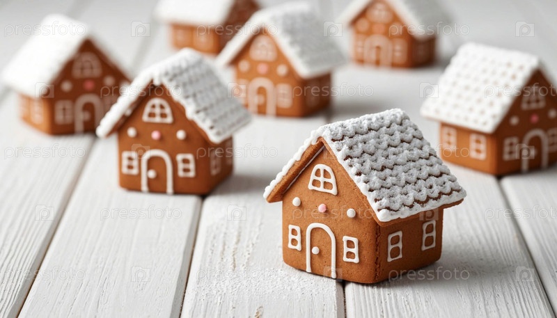 Хлебные дома на белом деревянном столе. Сгенерированный ИИ