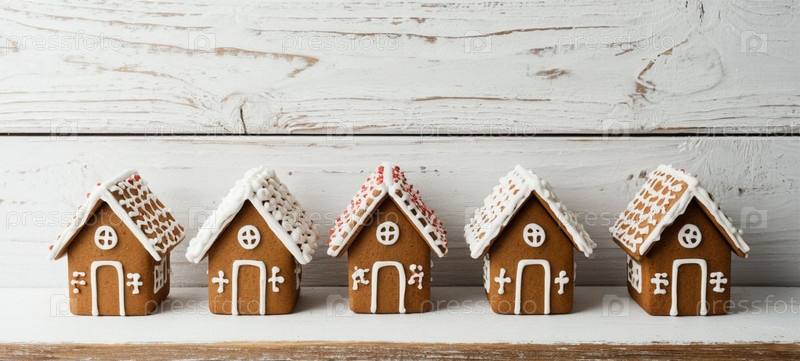 Хлебные дома на белом деревянном столе. Сгенерированный ИИ