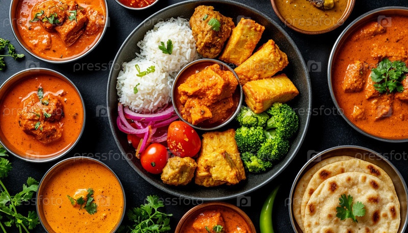 Индийские блюда на столе. Сгенерированный ИИ