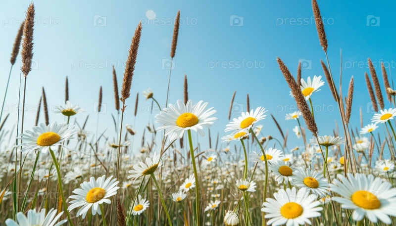 Дейзи и коктейли против голубого неба. Сгенерированный ИИ