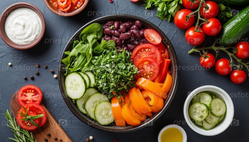Здоровая еда на верхнем столе. Сгенерированный ИИ
