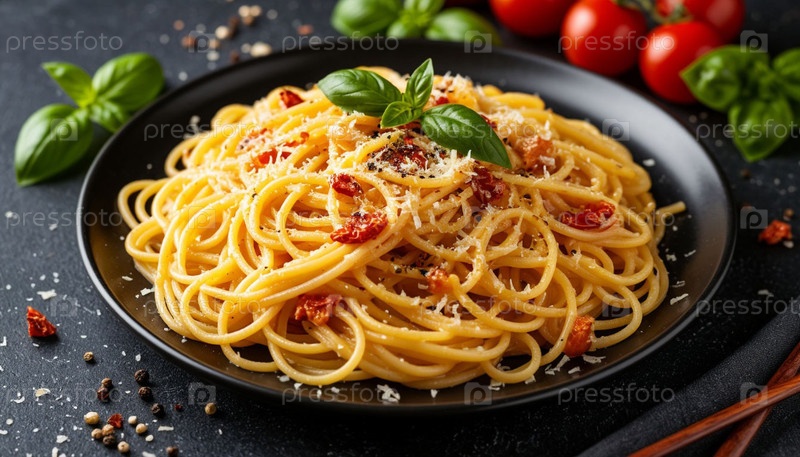 Итальянские спагетти в тарелке, вид сверху. Генерируется ИИ
