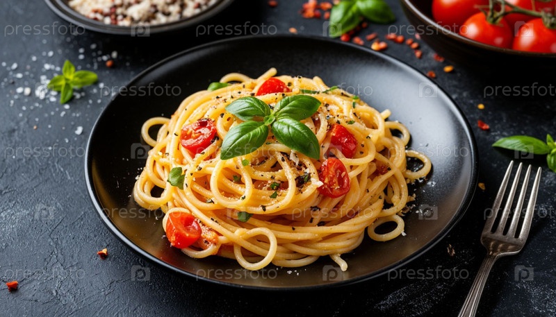 Итальянские спагетти в тарелке, вид сверху. Генерируется ИИ
