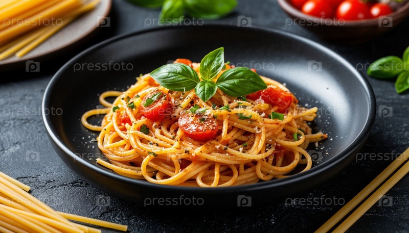 Итальянские спагетти в тарелке, вид сверху. Генерируется ИИ