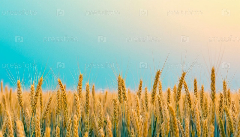 Спелая пшеница и нежное голубое небо, знамя. Сгенерированный ИИ