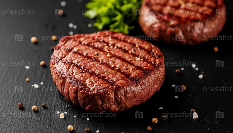 Мясо бифштекса на черном фоне, пространство для копирования. Сгенерированный ИИ