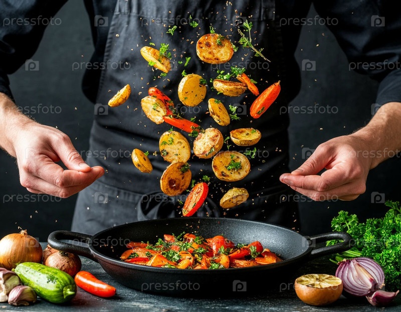 Руки шеф-повара готовят еду, выбрасывая ее в воздух, на темном фоне. Сгенерированный ИИ