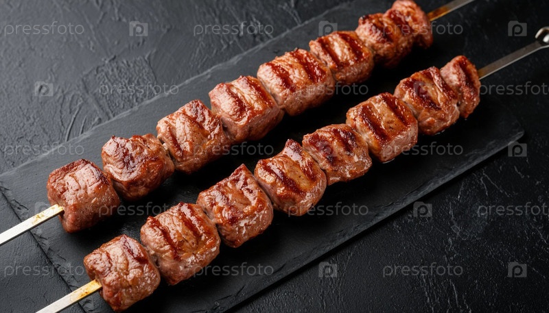 Шашлык на шашлыках. Темный фон, пространство для копирования. Сгенерированный ИИ