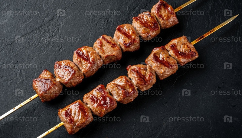 Шашлык на шашлыках. Темный фон, пространство для копирования. Сгенерированный ИИ