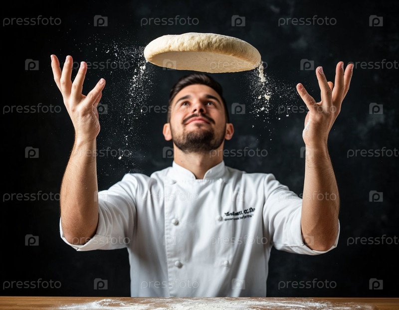 Руки Бейкера бросают тесто на черном фоне. Сгенерированный ИИ