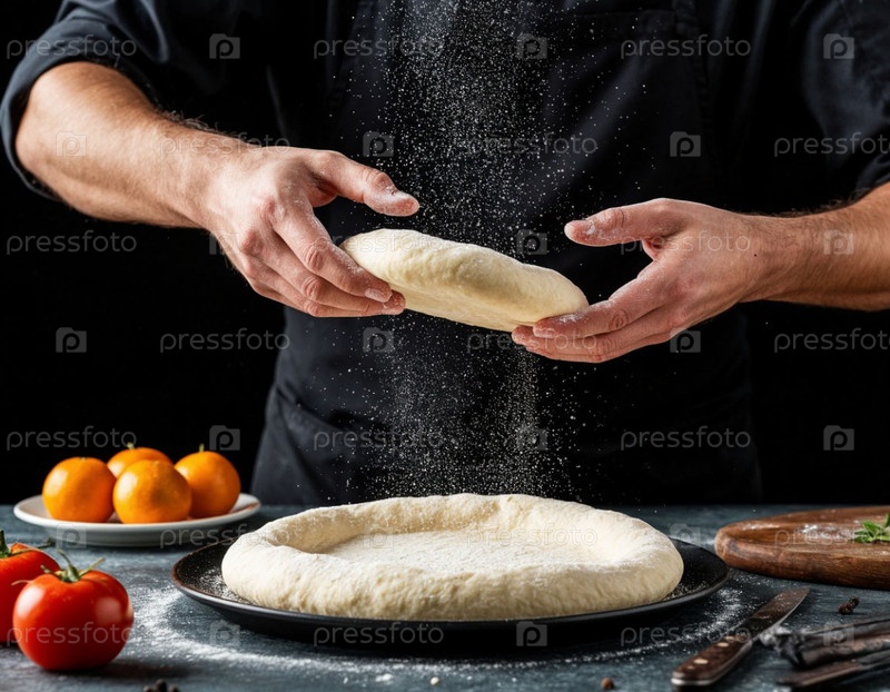 Руки Бейкера бросают тесто на черном фоне. Сгенерированный ИИ