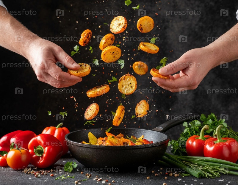 Руки шеф-повара готовят еду, выбрасывая ее в воздух, на темном фоне. Сгенерированный ИИ