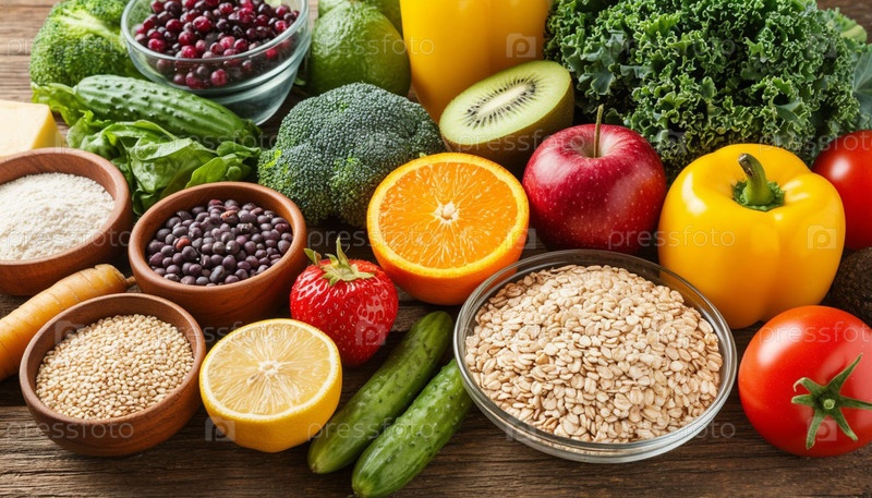 Здоровая пища с повышенным содержанием клетчатки, вид сверху. Сгенерированный ИИ