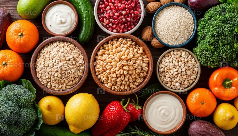 Здоровая пища с повышенным содержанием клетчатки, вид сверху. Сгенерированный ИИ