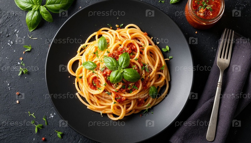 Пластина спагетти на черном фоне сверху. Генерируется ИИ