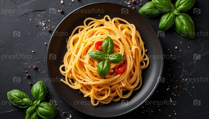 Пластина спагетти на черном фоне сверху. Генерируется ИИ
