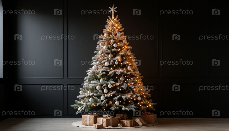 Новогодний интерьер в современной темной гостиной с новогодней елкой. Рождество. Новый год. Генерируется ИИ