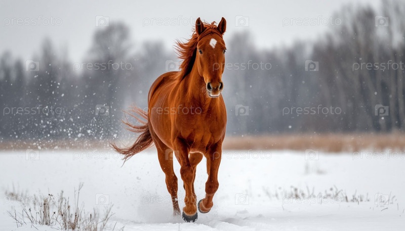 Огненная красная лошадь бежит по снежному полю. Сгенерированный ИИ