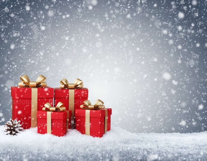 Подарки в сугробе, фон с копирайтом. Рождество. Новый год. Генерируется ИИ