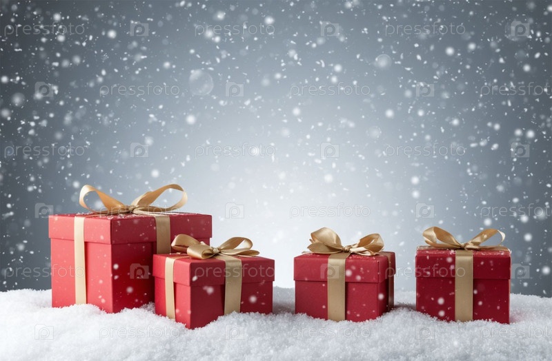 Подарки в сугробе, фон с копирайтом. Рождество. Новый год. Генерируется ИИ