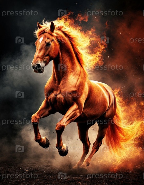 Огненный конь на темном фоне, символ Нового года 2026 года. Генерируется ИИ