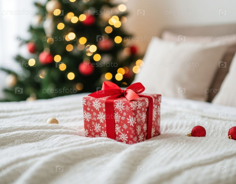 Новогодний подарок на кровати на фоне рождественской елки. Рождественский ИИ