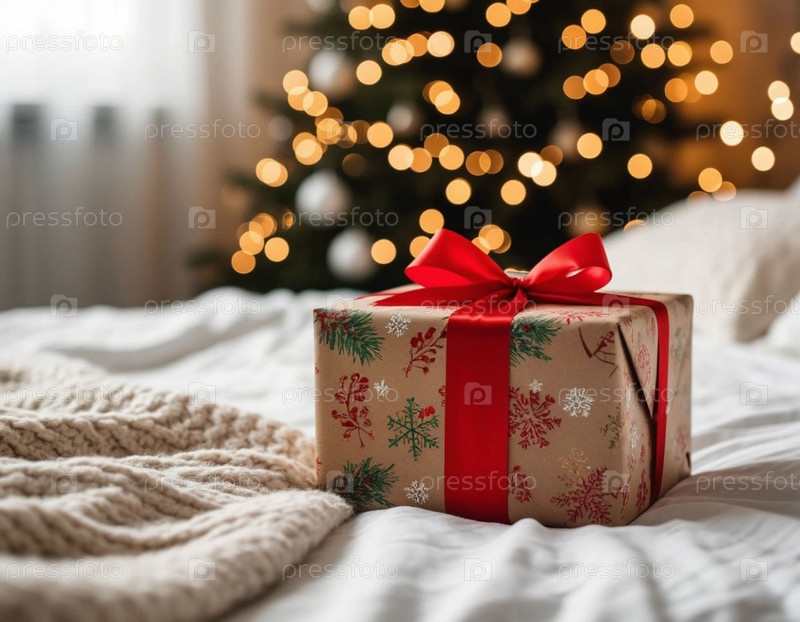Новогодний подарок на кровати на фоне рождественской елки. Рождественский ИИ