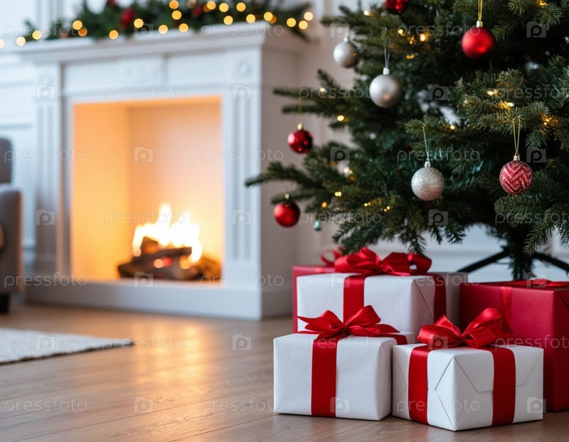 Новогодняя елка в светлом интерьере. Много подарков. Рождественский ИИ