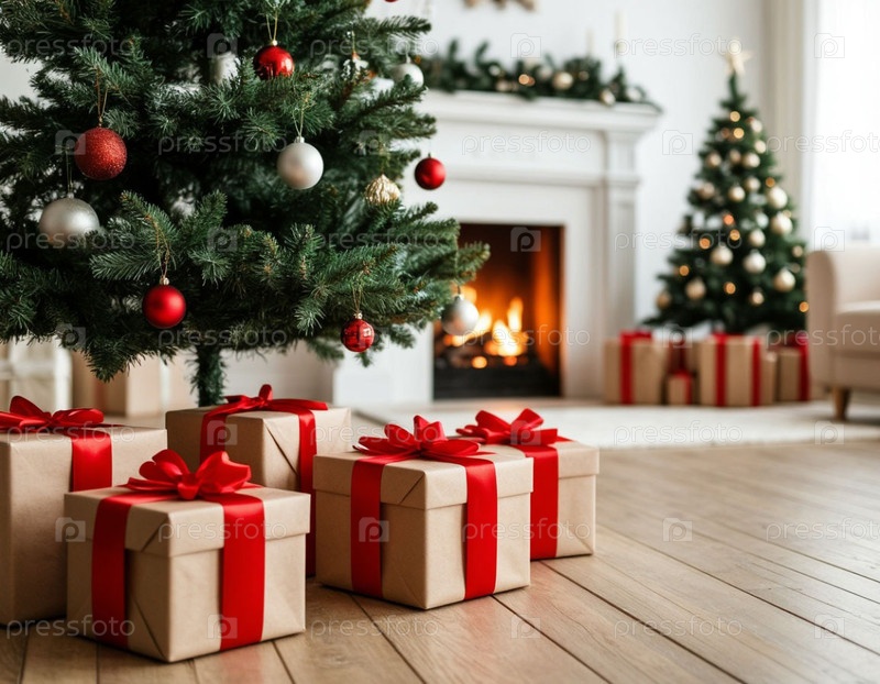 Новогодняя елка в светлом интерьере. Много подарков. Рождественский ИИ