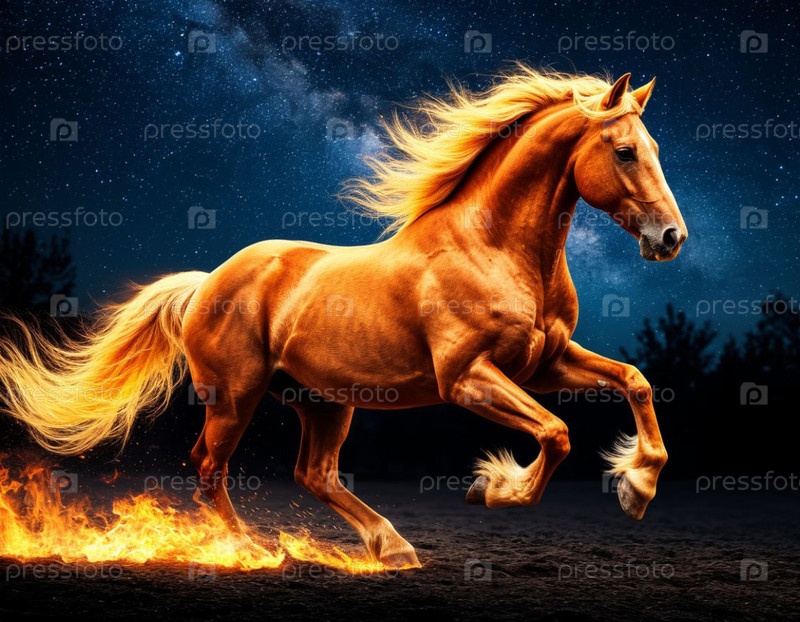 Огненный конь на темном звездном фоне. Символ Нового 2026 года. Генерируется ИИ